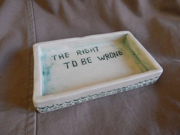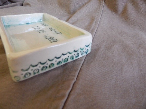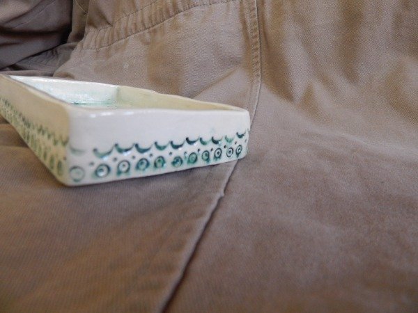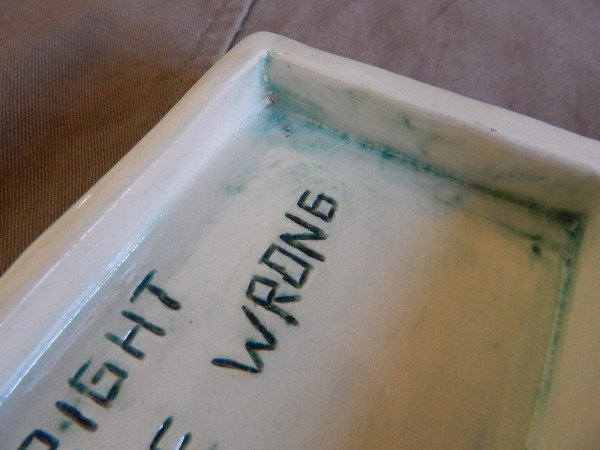 Es un platito rectangular, intervenido con bajo relieve y oxido de cobre. Esmaltado